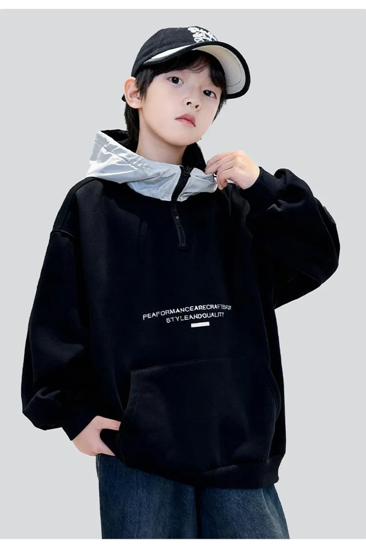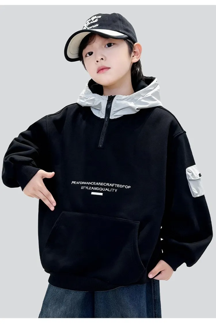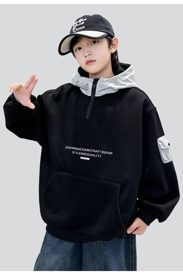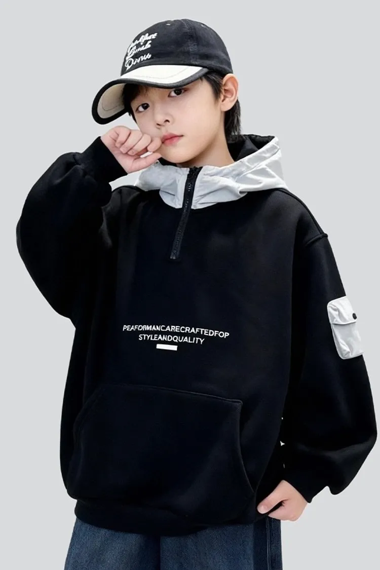 個性口袋拼接加絨帽TEE