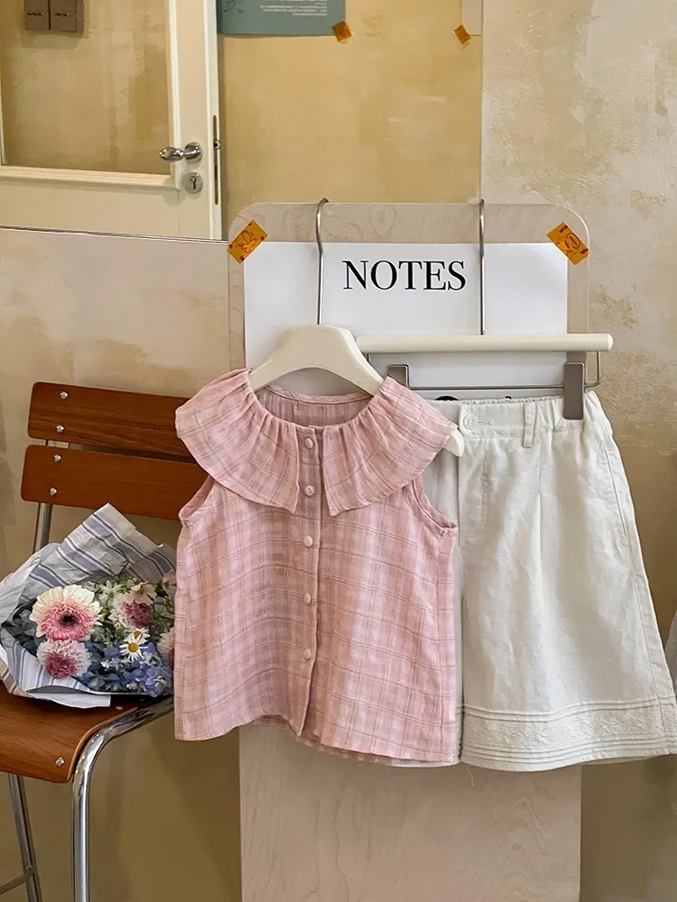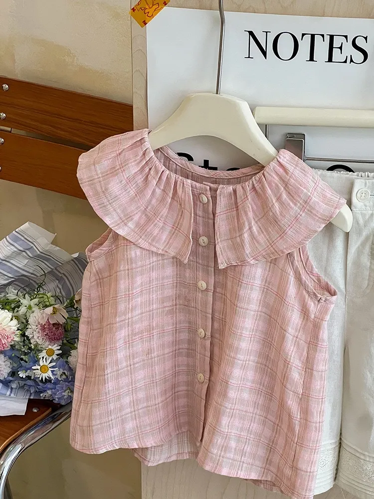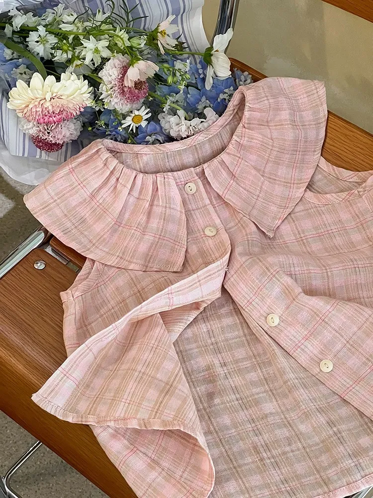 小格子棉麻娃娃領無袖TEE