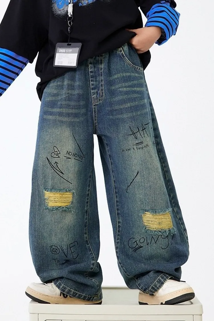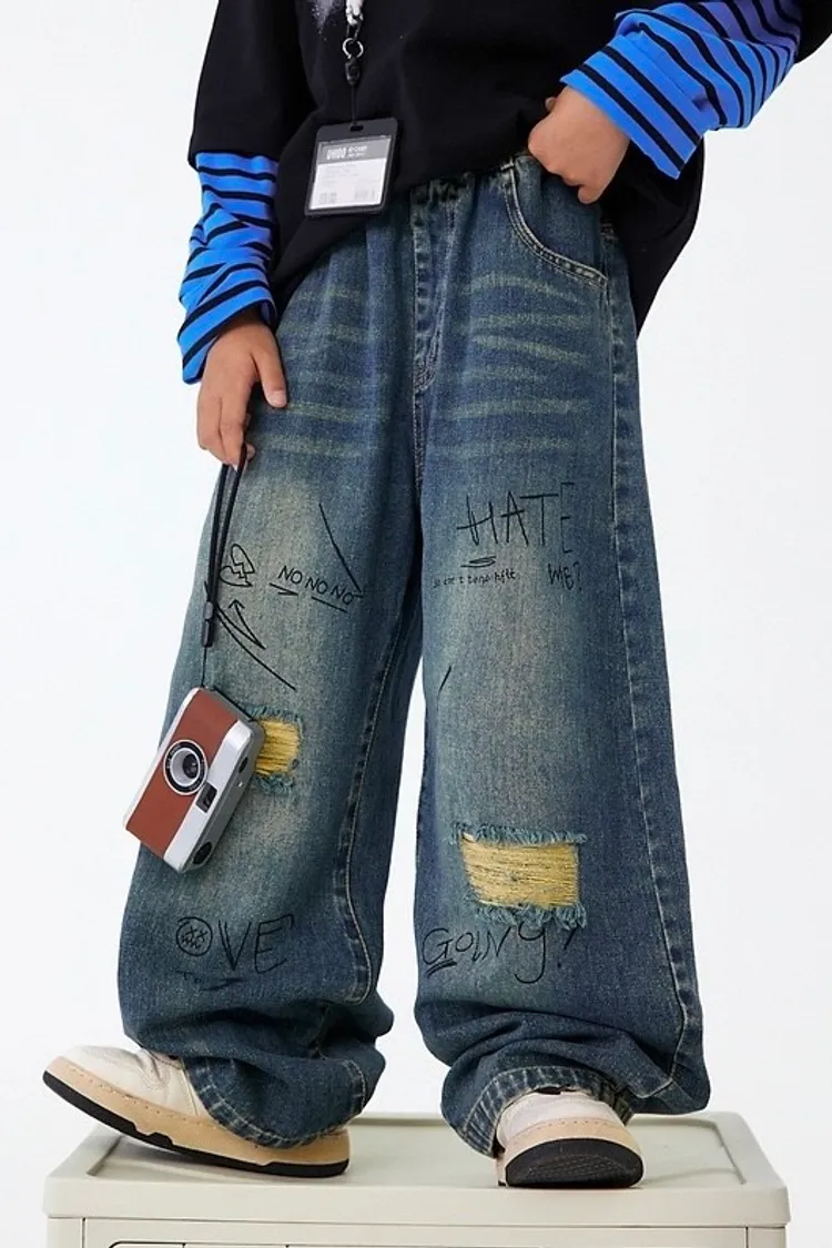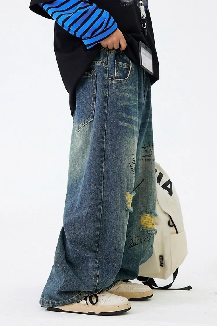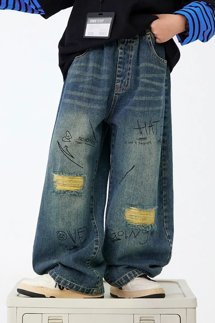 做舊破洞塗鴉軟牛仔褲