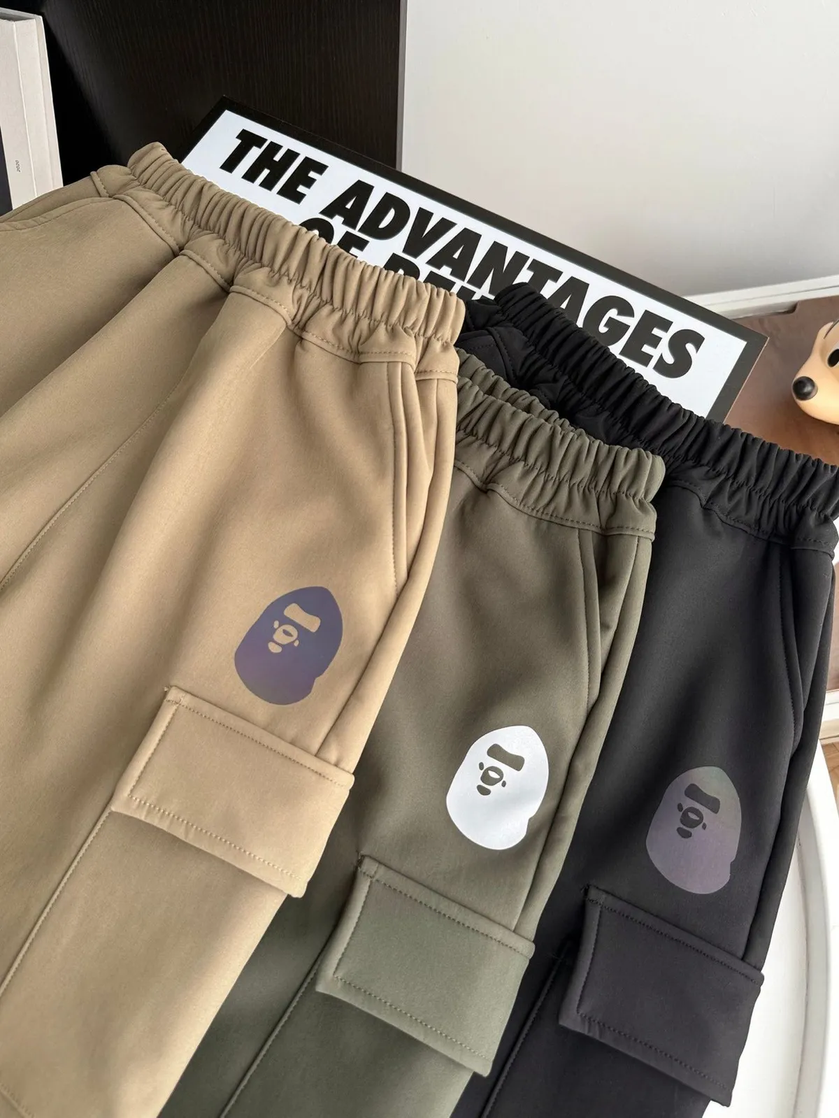 猿家字母側印貼袋加絨工裝褲