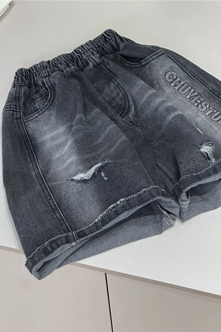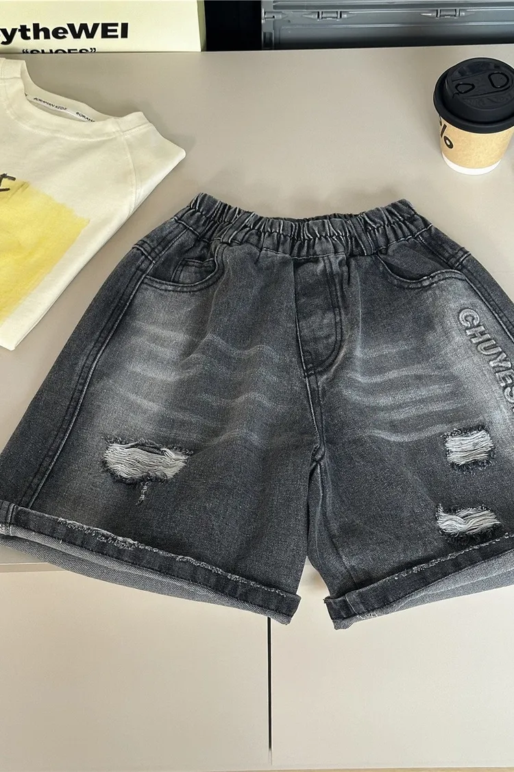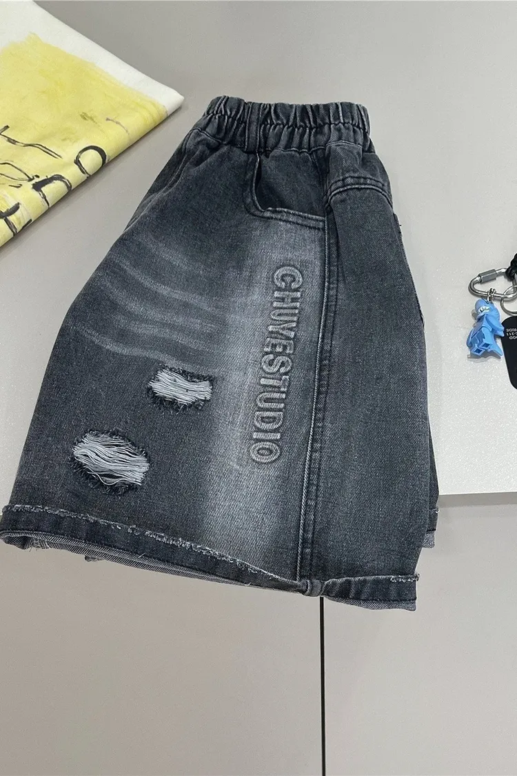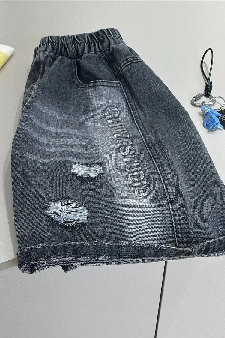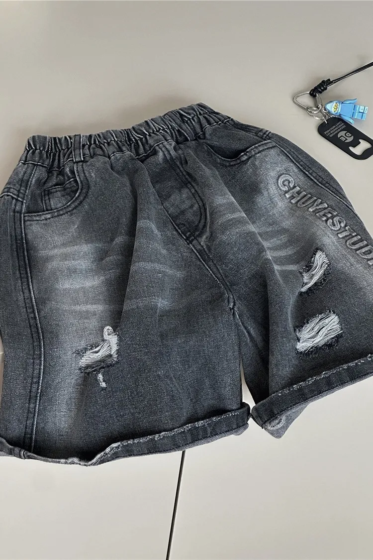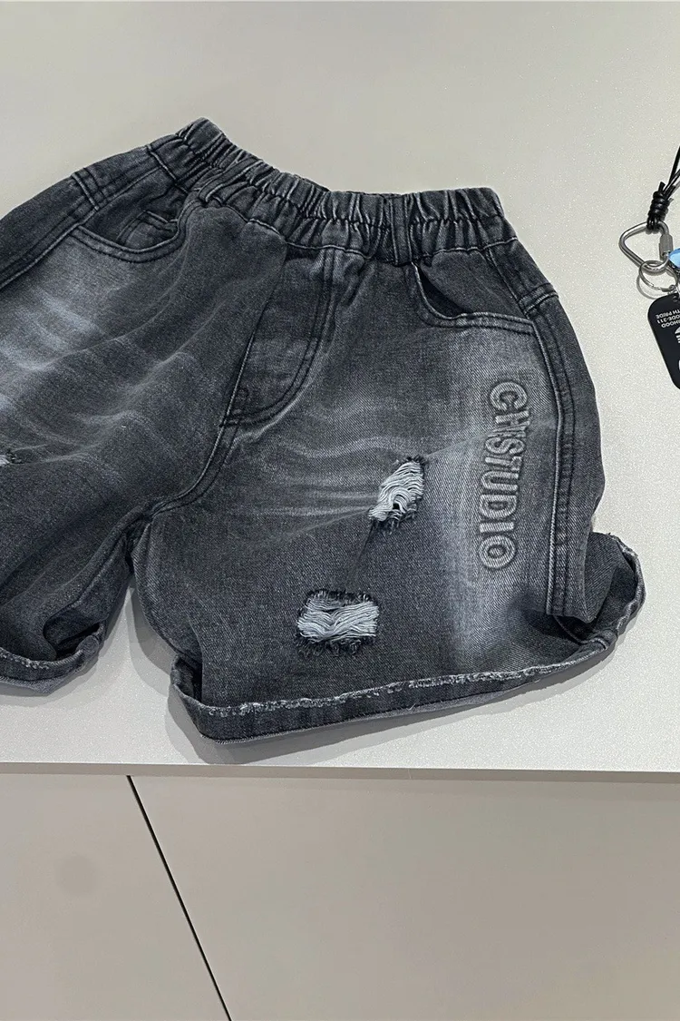 字母壓印破洞牛仔五分褲