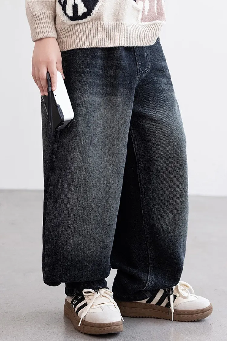 口袋描邊拼色加絨牛仔褲
