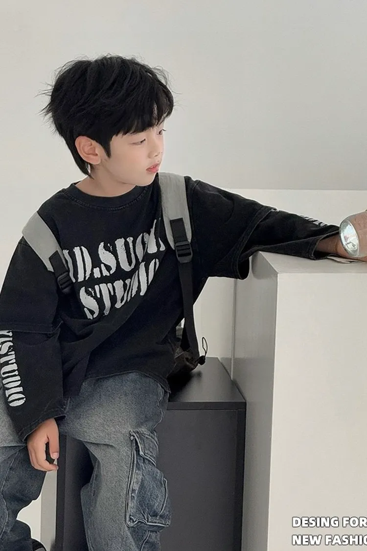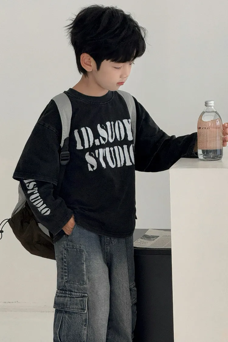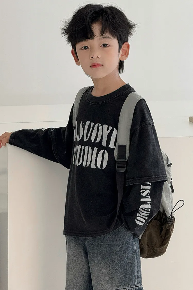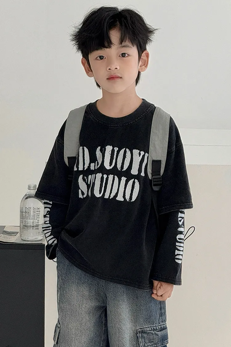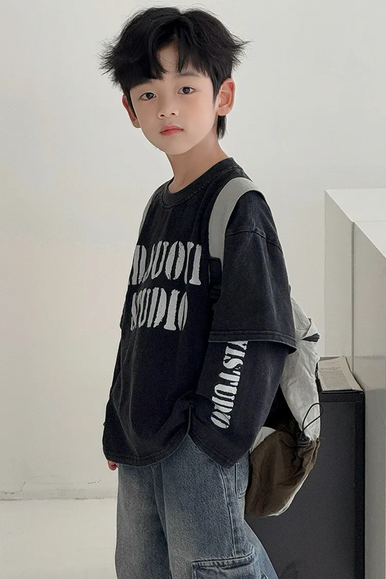 斑駁感拼接袖假兩件TEE